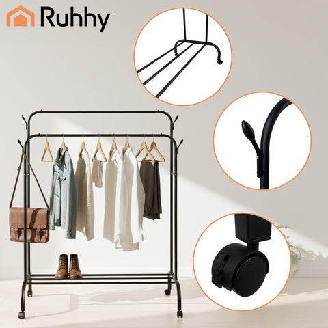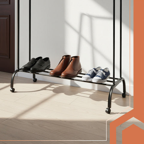 Praktisk tøjstativ på hjul med hylde og kroge